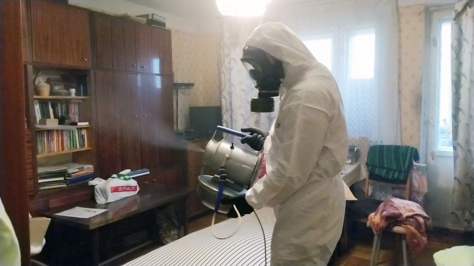 специалист проводит дезинсекцию безопасными препаратами